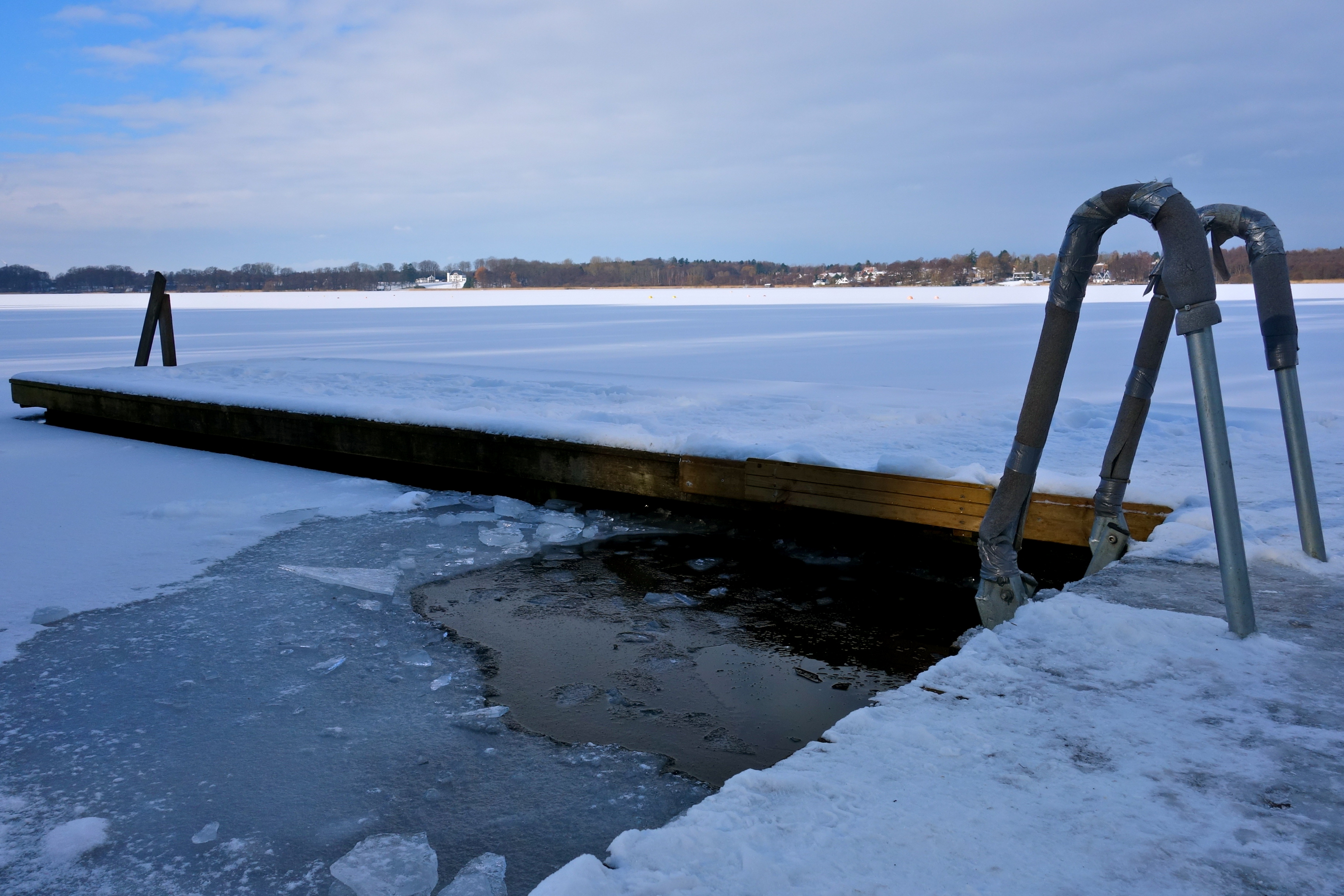 Jeg var ude på broen ved badeanlægget. Der havde allerede dannet sig et tyndt lag is efter morgenbadningen. Da jeg stod og så ned i det mørke vand, var det helt skørt at tænke på, at der er folk, som kan finde på at svømme under isen.