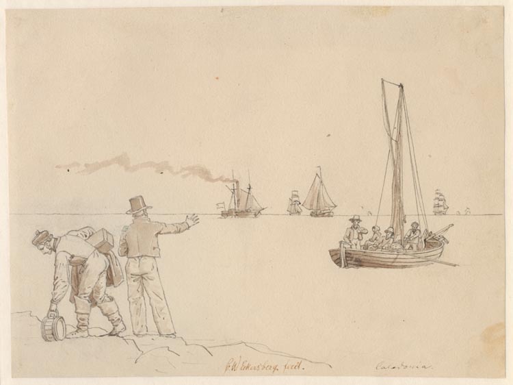 Passagerer saettes ud til Dampskibet Caledonia.