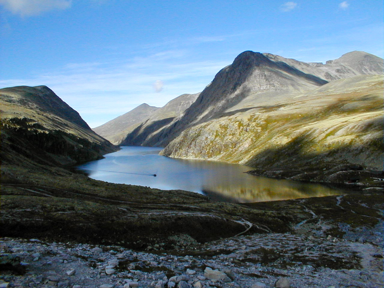 I Norge i Rondane ved Rondvassbu var søen, Rondvatnet fuldstændig blik dagen efter stormende kuling på fjeldet. En skræmmende og fantastisk oplevelse på samme tid.